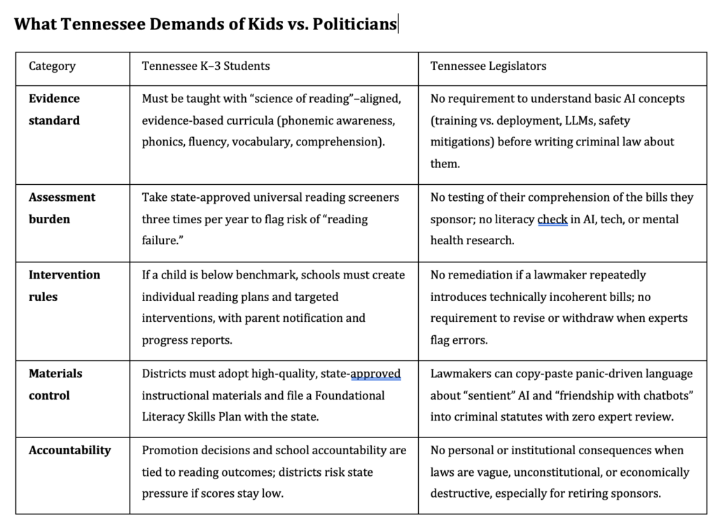 If this bill passes, Tennessee will become a legal black hole for AI innovation, a state where Silicon Valley companies geofence their products to avoid criminal liability, and where engineers can be prosecuted for teaching machines to be kind.