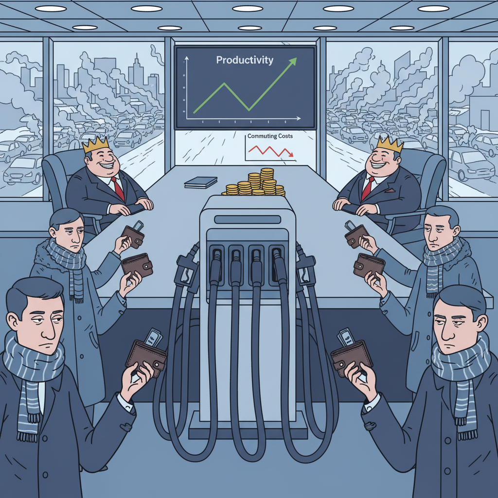 Return‑to‑office mandates shove those costs squarely back onto workers in a labour market that is already precarious. Studies on RTO consistently note that commuting expenses, time lost in traffic, and the rising price of fuel are among the biggest sources of resentment and “resenteeism”: people staying in roles but mentally checking out. At the same time, analysis of S&P 500 firms shows many companies rolled out RTO after their stock prices slumped, as a kind of theatrics to signal discipline to investors rather than to solve a real productivity problem. It is a symbolic flex that functions as a pay cut: more out‑of‑pocket costs and unpaid hours for employees, without a matching raise.