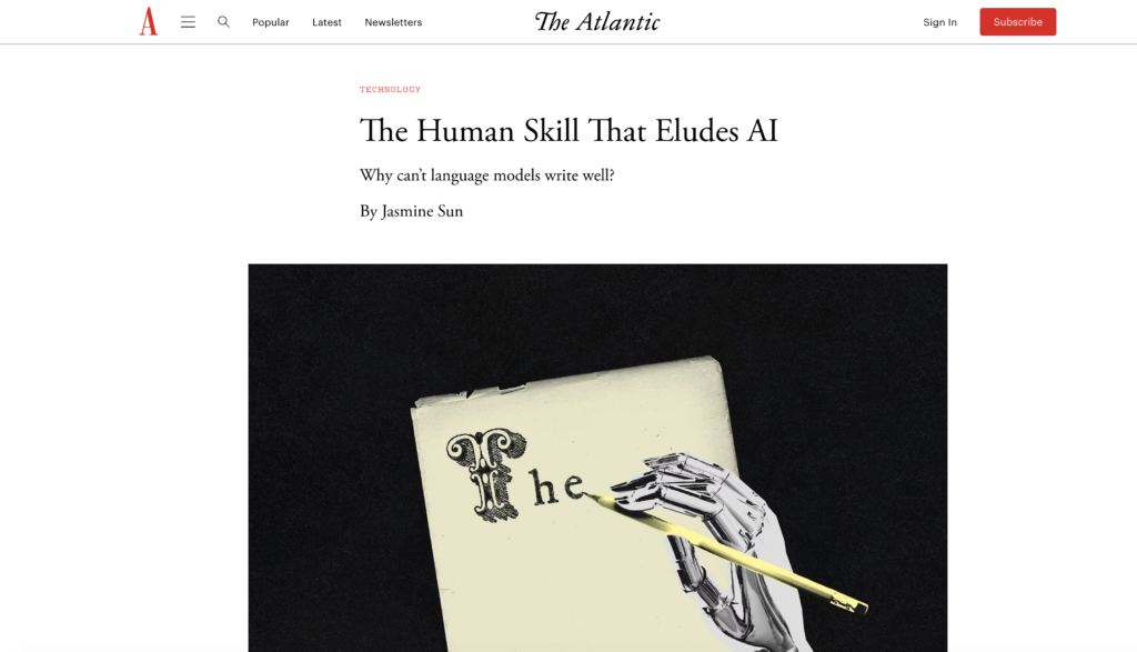 The Atlantic was never a good magazine. Its sophistry has always been blaring, but it knows how to pander to light thinkers who want to cosplay as learned. Case in point: Jasmine Sun’s “The Human Skill That Eludes AI.” Rhetorically, it’s a polished piece. The problem is that its facts and premises are shaky at best.