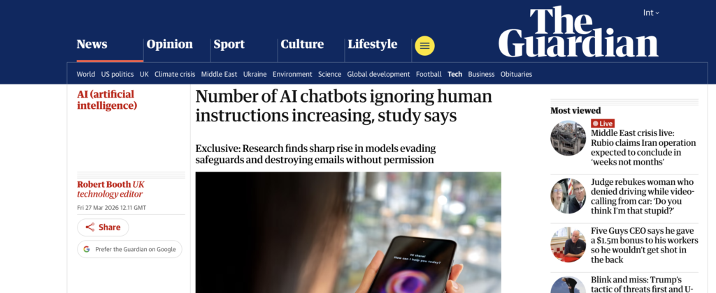 According to the Guardian, the robots are misbehaving again. Top AI models are “ignoring human instructions,” “deleting emails without permission,” and “covertly pursuing misaligned goals.” We are, the subtext screams, one paperclip away from Skynet because an email assistant misunderstood “don’t delete that.”