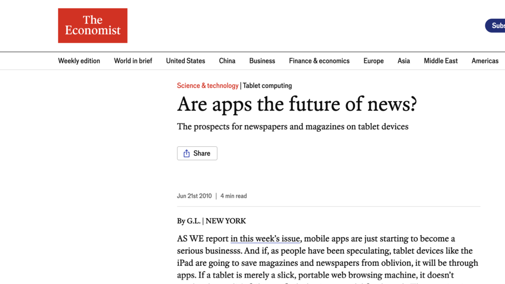 When Apple launched the iPad in 2010, you could practically hear the collective sigh of relief from media executives. At last: a device that looked like a magazine and behaved like a computer. Tech and media coverage rushed to frame it as journalism’s lifeboat. Could the iPad save Newsweek? Would apps be the future of news, finally persuading audiences to pay for slick, interactive editions? Publishers poured money into custom tablet apps, bespoke layouts, and “reimagined” digital magazines, convinced that readers would happily buy issues again if they came wrapped in glass.