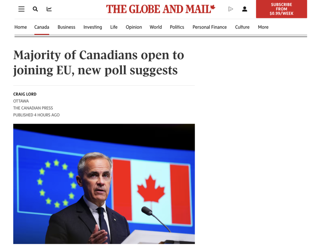 Within 24 hours of the newest poll, major outlets all push variants of the same story: could Canada join the EU; should Canada join the EU; majority open to exploring it. TV segments “just asking questions” walk viewers through the hypothetical, often conceding in passing that it would be difficult, but spending all their time treating the premise as worthy of serious contemplation.