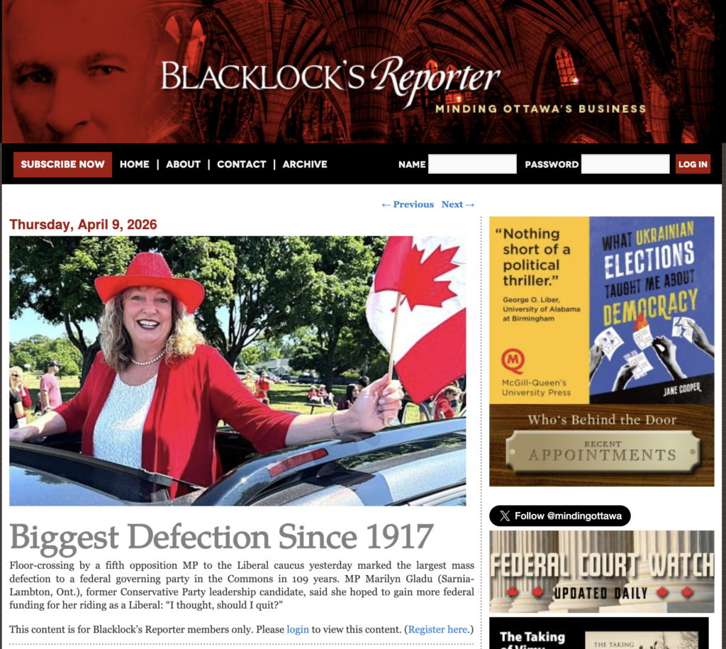 Marilyn Gladu (Sarnia-Lambton) became the fifth MP, and fourth Conservative to cross the floor to the Carney Liberals since November 2025, making it the largest mass defection to a governing federal party in 109 years.